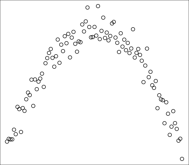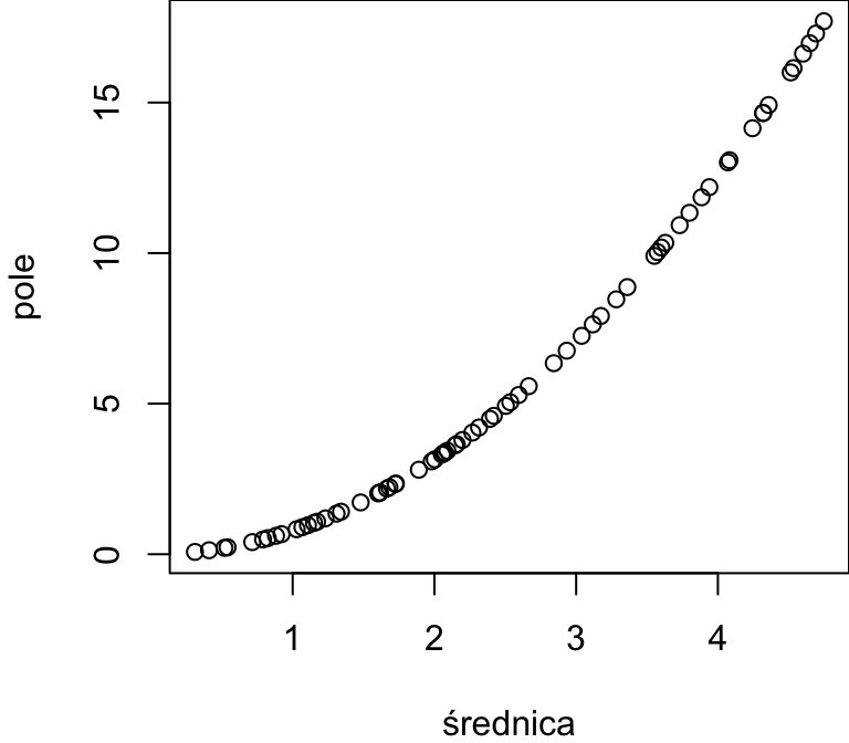 Pytanie 8.7 Okrąg o średnicy d ma pole powierzchni \(\frac{1}{4}\pi d^2\). Wykreślamy wykres rozrzutu pola powierzchni względem średnicy dla próbki okręgów.